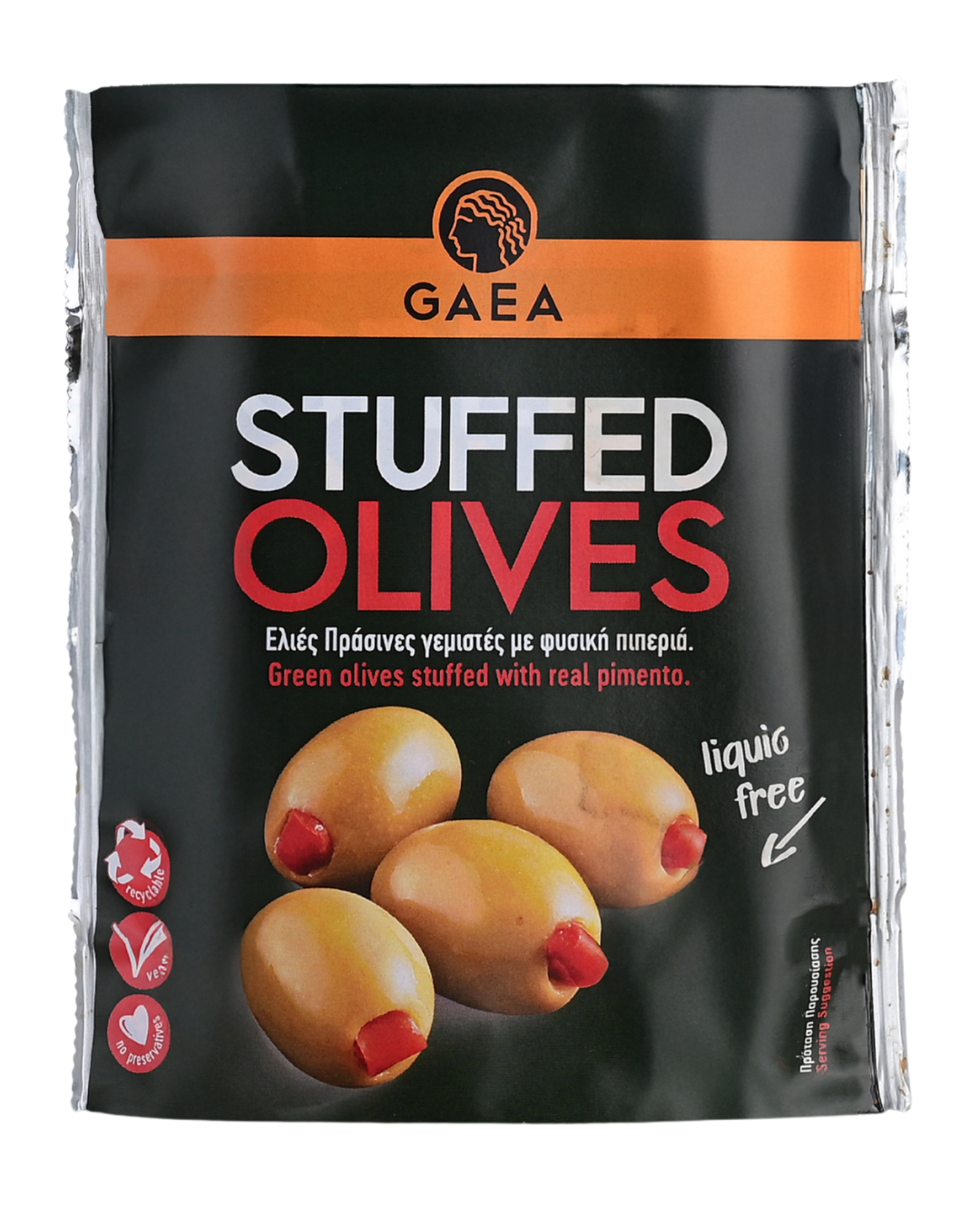 Πράσινες ελιές με πλούσιο άρωμα και τραγανή υφή, γεμισμένες στο χέρι με φυσική πιπεριά, μαριναρισμένες σε Εξαιρετικό Παρθένο Ελαιόλαδο για πλούσια γεύση.